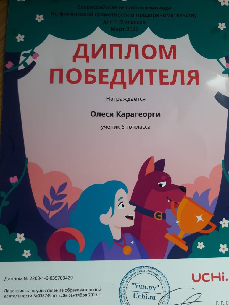 Ученица 6б класса нашего лицея Карагеорги Олеся стала победителем Всероссийской онлайн-олимпиады по финансовой грамотности для 1-9 классов